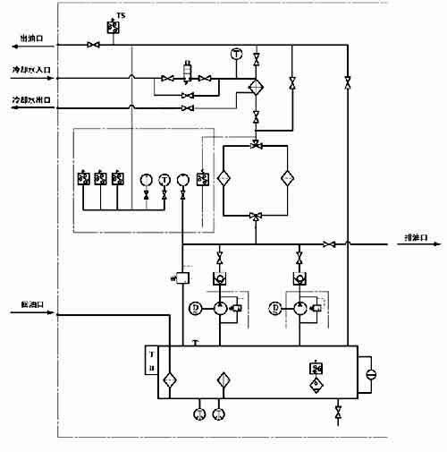 2、在冷卻器的進水口裝有一個直讀式溫度計和電磁水閥,用來觀察進水溫度和控制冷卻水的通或斷。在系統的出油口處,裝有一個電接點、溫度計和溫度控制器,用于控制工作油溫;當出口油溫高于某一調定的溫度時,電磁水閥自動開啟,冷卻器投入工作,直到油溫恢復正常為止。如冷卻器已投入工作,系統的油溫繼續上升,達到最高溫度時,溫度控制器發出油溫過熱報警信號。當冷卻器需要更換或維修時,可關閉冷卻器的進出口閥門,打開旁路閥門,油液即不經冷卻器直接送往潤滑點。
