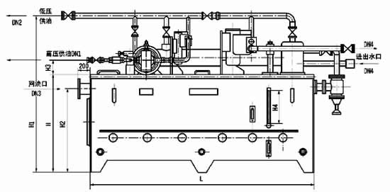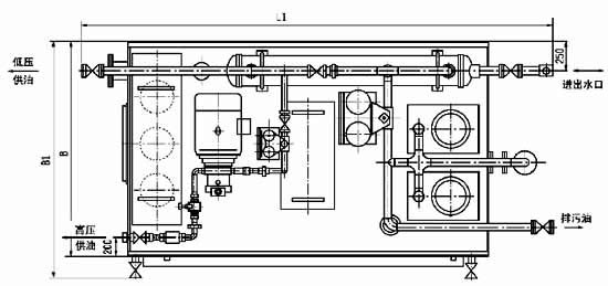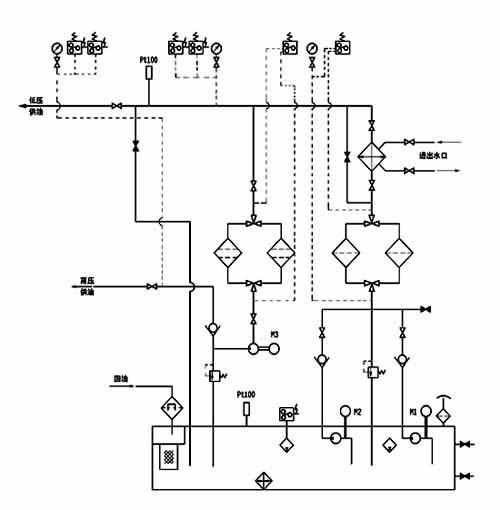 本油站為整體式,由油箱、兩臺低壓油泵、一臺高壓油泵、二臺雙筒網(wǎng)片式過濾器、回油磁網(wǎng)過濾裝置、列管式油冷卻器、各種控制閥門、管道以及電接點壓力表、鉑熱電阻等組成。